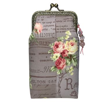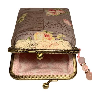 Anyaga: dekoratív, a vintage stílus minden kellékét bemutató, lila színekben tobzódó designer pamutvászon, bélése halvány mintás pamutvászon, egyedi kézműves termék. 8,5 cm-es, szögletes, antik bronz színű, antikolt fémkerettel kapta meg végleges formáját. Közbélésekkel merevített, pamut csipkével díszítve, kis ásvány-függővel felszerelve készült el. Méretei: 17cm magas, 8,5 cm széles, 2,5 cm-es talppal. Az árak AAM árak.