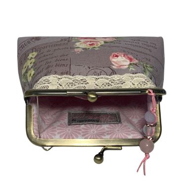 Anyaga: nagyon kedves, írás és rózsás mintás vintage designer pamutvászon mályva színű alapon. Bélése színben harmonizáló pamutvászon, egyedi kézműves termék.
