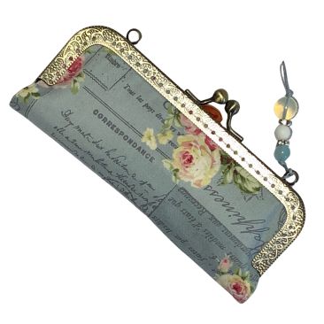 Anyaga: nagyon kedves, írás és rózsás mintás vintage designer pamutvászonkékes-szürke színű alapon. Bélése színben harmonizáló pamutvászon, egyedi kézműves termék.