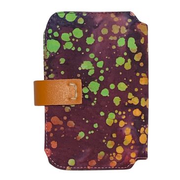 Anyaga: nagyon látványosan, a bordó, zöld, lila és sárga színek különböző árnyalataiban tündöklő batikolt designer pamutvászon. Bélése színben harmonizáló mintás pamutvászon, egyedi kézműves termék.
