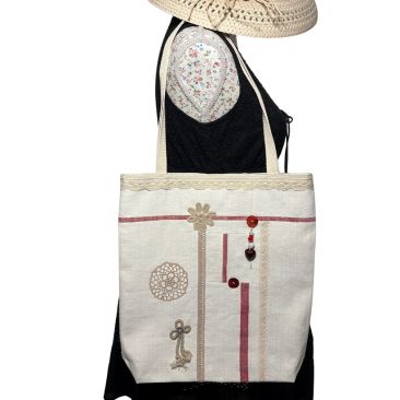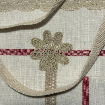 Anyaga: kézzel szőtt csíkos, natúr lenvászon maradák darabjaiból összevarrva készült, amelynek a beleszőtt piros csíkozása, rózsaszirommal festett csipkék és festett kagylógomb a díszítése. Bélése színben harmonizáló pamutvászon, egyedi kézműves termék.