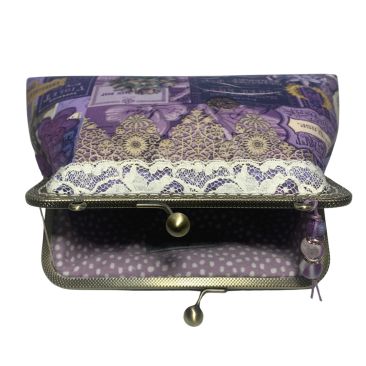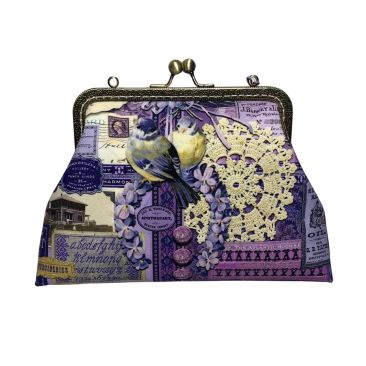Anyaga: dekoratív, a vintage stílus minden kellékét begmutató, lila színekben tobzódó designer pamutvászon, bélése halvány mintás pamutvászon, egyedi kézműves termék. 15 cm-es, antikolt bronz színű acél, szögletes fémkerettel készült. Közbélésekkel merevített, pamut csipkével díszített, belső zsebbel és kis csillogó -üveg függővel felszerelve.